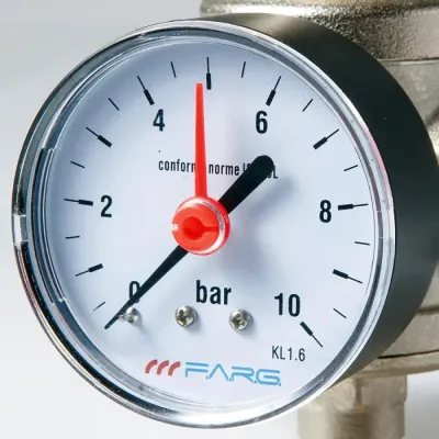 Настроить необходимое давление на редукторе FARG можно с помощью ключа. Если крутить по часовой стрелке давление увеличивается, против часовой стрелки – уменьшается. Увидеть настроенное давление можно с помощью манометра.